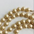 こちらはユリア樹脂素材の原玉に、オリジナルパール塗料にて何層にも渡り重ね塗りを施した日本製樹脂パールネックレスになります。パールの間1つづつ丁寧に結び目を入れたオールノット加工にて仕上げました。パールカラーは、きめ細かい質感と優しい艶感が特徴のライトゴールド。薄めのゴールドラーで落ち着いたやさしい色合いのオリジナルカラーです。クラスプにはクラシックスタイルのカラビナフックタイプを使用。サイズは直径約8mm玉で、長さは服の上からでもゆったり着けられるマチネーサイズの全長約60cmになります。