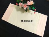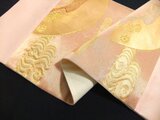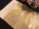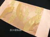 ピンク地に金糸が細かく織り込まれていますのでピンクピンクという色合いではなく光の加減で色合いが変わります。扇面吉祥花草文様です。両端は他の帯の中無地(絹)を使用しました。