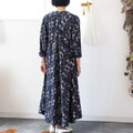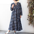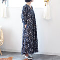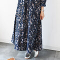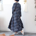 ブロックプリントリボンフレアーワンピース【インディゴ花柄C】