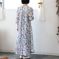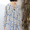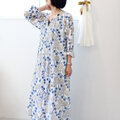 ブロックプリントリボンフレアーワンピース【ホワイト花柄】