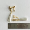 こちらは樹脂素材で雫型/ドロップタイプのパーツに、弊社オリジナルパール塗料にて何層にも渡り重ね塗りを施した日本製樹脂パールイヤリングになります。ドロップパールのパールカラーはきめ細かい質感と優しい艶感が特徴のホワイトピンク色。ホワイトベースながら、外周に向かってほのかなピンクの干渉色が浮き出る個性的な色合いのオリジナルカラーです。直径約9x26mmのドロップ型パールと、ラインストーンを使ったクロスデザインのビジュー金具を使用。イヤリング金具はネジバネ式ですので、脱着も比較的手軽で細かな調節が可能です。