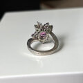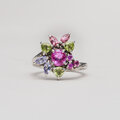 プラチナ900製、綺麗な濃いめのピンクサファイア(オーバル)1.148ct を中心にペリドット、アイオライト、ピンクトルマリン、ピンクサファイア(ラウンド)を取り巻いたブーケのような配色の一点もののリングです。ゴージャスですが、中心のピンクサファイアは高さを抑えているので、カジュアルでも使っていただけるデザインです。