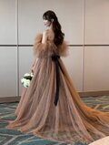 実例写真!優しい カラードレス オフショルダー シャンパン色 キラキラチュール サッシュベルト 披露宴/結婚式