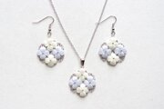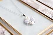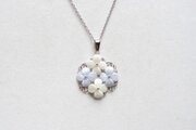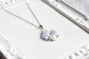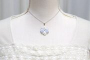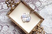 樹脂粘土で作ったホワイトと淡いブルーの紫陽花を透かしパーツに咲かせた、清楚で可憐なペンダント。