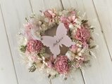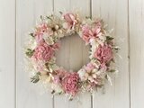 ハンドメイドフラワーのソラローズやプチフラワーをアクセントに、アジサイやイモーテル、インディアンコーン、ストーべなどをアレンジしたピンクのリース。
