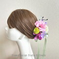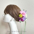 ピンクのラナンキュラスとミントリボンの髪飾り 浴衣 パープル ピンク ミント 花火大会 お祭り 浴衣髪飾り