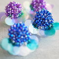 今回は紫陽花をイメージしたパープルのビーズを数種類使ってランダムに編んだ丸とアジサイのブルーと雨の透明、それに葉っぱのグリーンが雨に濡れたかのような雰囲気のある透き通ったスパンコールを合わせました。