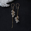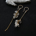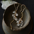 大粒のハーキマーダイヤモンド※を、5粒ずつ使ったロングタイプのアシンメトリーピアスです。クリスタルの力強くゴージャスな輝きがリュクスな雰囲気を醸し出す素敵なピアス。左右とも螺旋を描くように留めているので、クリアとゴールドのラインがきらきらと光を放ちとてもきれいです。