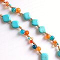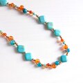 太陽のように輝くオレンジのカーネリアンと、澄み渡る海を思わせるターコイズブルーのマグネサイトターコイズがダイヤ型に連なり、首もとを彩ります。