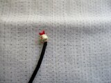 中綿を入れ、正絹の黒の着物で作ったループを付け、ループの先に、トンボ玉と山サンゴを付けています。