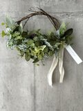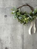 サイズ23×18㎝上質なアーティフィシャルフラワーを集めたリースです。色々なグリーンが集まりました。動きをつくりましたので近くで見たらアーティフィシャルフラワーということは分かるかもしれませんが、遠くから見ると自然な印象です。メンテナンス要らずでドアの外側にも飾っていただけます。アーティフィシャルフラワーですが適した環境は光が当たりにくい暗い場所ですと日焼けなどせずより良い状態を保ちます。