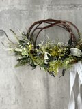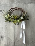 サイズ約20×30㎝ツルの曲線や葉の動きを出しました。長くお楽しみ頂けるプリザーブドフラワーで仕上げました。時間経過によりいずれはゆっくりと退色していきますが、飾る場所によって色もちは異なります。なるべく光や日差しが当たらない涼しい屋内の場所ですと、いい状態を保ちやすいです。お花が過ごしやすい場所に飾ってあげるのもいいのですが、お客様が1番飾りたい場所で飾っていただくのもいいかもしれません。