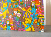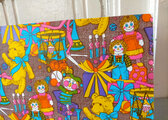 薄手ですが、ハリのあるしっかりとした紙質。ぱっちりおめめがキュートなラガディ・アン&アンディのお人形やテディベア、ラッパにドラム、ボールやびっくり箱など沢山のおもちゃが、紙いっぱいに描かれています。まるでおもちゃ箱をひっくり返したような、眺めているだけで楽しくなるようなカラフルでポップな一枚。