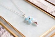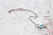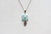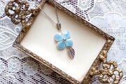 樹脂粘土で陶器風の艶やかな青色の紫陽花を作り、葉っぱチャームをあしらった可憐なペンダント。