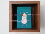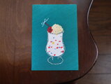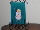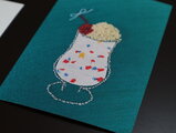 グラスは、ラメ糸でフリーステッチングにより仕上げています。クリームも同じくフリーステッチングにより、刺繍糸でループを作っています。また、サクランボは、赤いビーズを使ったビーズ刺繍、軸の部分は手刺繍。ソーダ部分は、シュワシュワ感が表現できる布をコラージュ。いっぱいの想いを入れ込んでみました♪