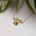 葉っぱのデザインに添わせたトルマリンは淡いピンクからグリーンの色味、そしてキャッツアイもあります。やさしく柔らかいイメージのルースに葉っぱのデザインがなじんでいる一点もののネックレスです。