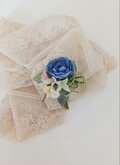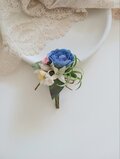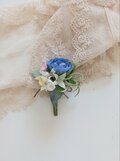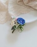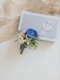 紺ブルーに染めたミニ薔薇に、小花と葉を添え花束にし、お洒落なコサージュに仕上げました。