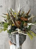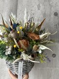 サイズ約27㎝慌ただしく過ぎる毎日。やっぱり目に留まる置き型アレンジメントはちょっとひと呼吸置ける存在。ご家族みなさんにもご覧いただけたら嬉しいです。長もち素材ばかりを選びアレンジしました。深いブルーのお色味とワイルドフラワーと相性がうまくマッチしてくれました。プリザーブドフラワーを多めに使用。1部ドライフラワーもございますが変化が起きにくい花材を厳選しております。適した環境は涼しめの光が当たりにくい暗い場所が1番いい状態を長く保ちます。次に日陰です。
