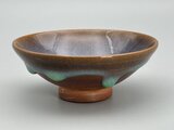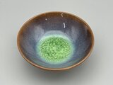 雑木灰を主原料とした釉薬を掛けています。中心に向かって透き通った翡翠色の釉薬が溜まり、貫入(かんにゅう)と呼ばれる釉薬表面の細かいヒビが複層して入り、光が乱反射してキラキラ輝いて見えます。なんとも言えない奥行きのある色合いで、見ても使っても楽しい作品で、酒器だけでなく、ホテルでは小鉢として前菜を盛り付けたり、ご家庭ではお酒のあてや一品のおかず、キャンディ入れとしてお使いのお客様もいらっしゃいます。様々な使い方でお楽しみいただけます。
