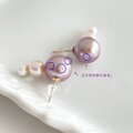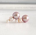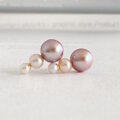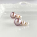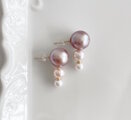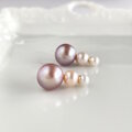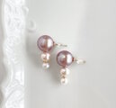 モーヴカラーのルベルパール(淡水パール)とチャイニーズアコヤ、アコヤパールの大きさの異なるパールを3粒、縦に並べたピアス。