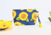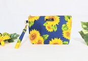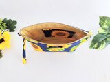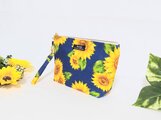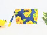 ブルーの綿オックス生地に明るく可愛いヒマワリの花柄の持ち手付きポーチです。