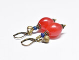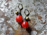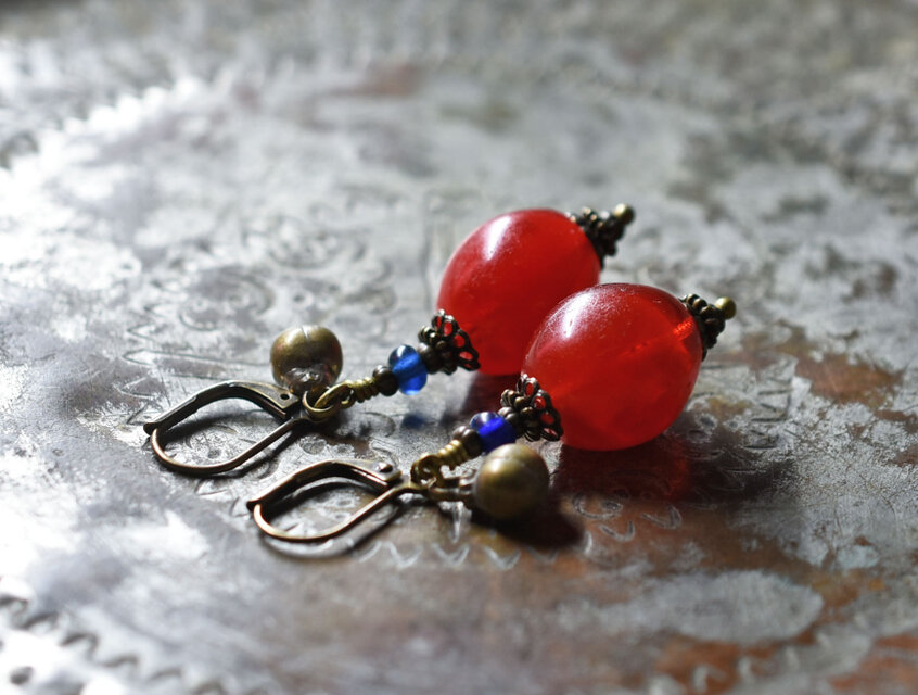 レッドエチオピアンチェリーとブルービーズ、民族鈴を繋いだピアスです。