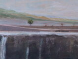 この絵を描くための取材で、滝を訪れた日は曇り空でした。けれど晴天の強いコントラとよりも、淡く彩られた風景に落ち着いた雰囲気が気に入って曇り空の原尻を描きました。