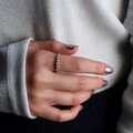 リング外周に等間隔で配置されている小さな突起はギアのような印象を与え、シンプルながらも特徴的なリングです。