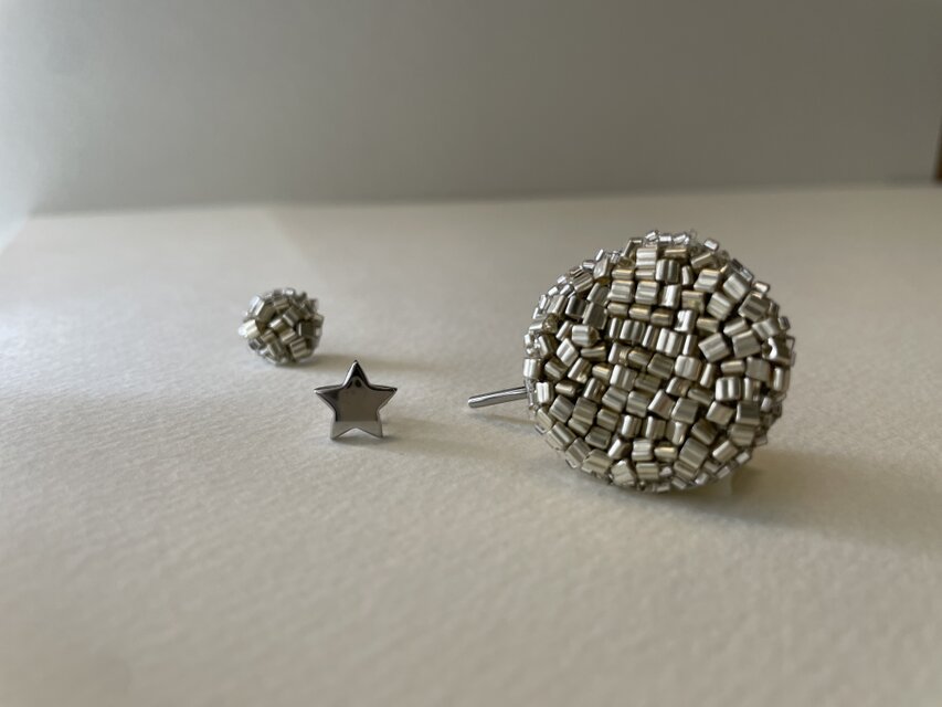 銀色のガラスビーズを、バランスを見ながらひと針ひと針丁寧に縫い付けて制作しています。