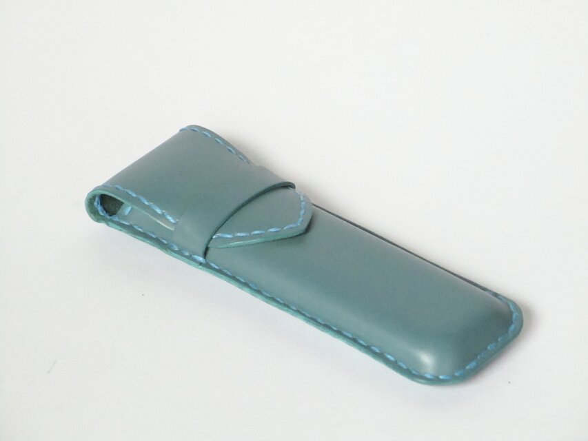 イタリアの最高級牛革ブッテーロ、発色の良さで知られていますが、そのターコイズでペンケースを作りました。手縫いです。