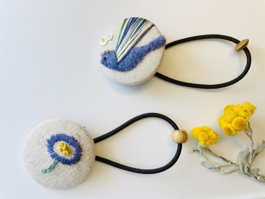 気持ちよく飛ぶ青い鳥、元気に咲く花、物語が始まりそうなステキなヘアゴムです。