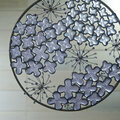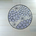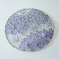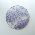 紫陽花のパーツは 光で色が変化するガラスと紫や青を薄く重ねて焼成することで、リースの下から上に向かって微妙にトーンの違う花色になっています。