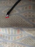 中綿を入れ、黒の着物で作ったループを付け、ループの先に、トンボ玉と山サンゴを付けています。