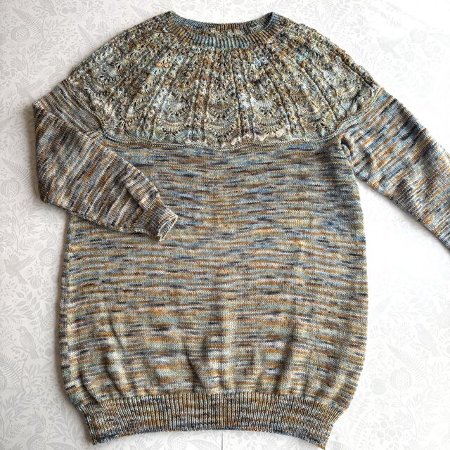 モヘアの美しいグラデーションの波がとても素適な丸ヨークセーターが届きました。上質な毛糸で丁寧に編みこまれていてとても軽いです。猛暑の夏を元気に乗り越えて、ステキなセーターに袖を通せる日を楽しみにしております^^どうもありがとうございました。
