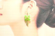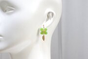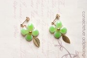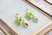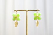 樹脂粘土で陶器風の艶やかな黄緑色の紫陽花を作り、葉っぱチャームをあしらった可憐なピアス。