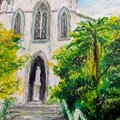 階段の両脇の木々を抜けると現れる白い教会のイラストです。