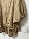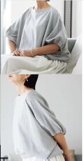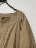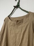 お袖は五分丈のバランスで、肩から身頃にかけてのドレープがデザインポイント、切り替え衿の前中心にスリットが入りワンポイントになっています。袖口と裾に細コールゴムを入れ、ふんわりと締め付け過ぎない設計です。