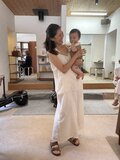 肌触りの良い、上質なやわらかコットンを贅沢に2枚重ねて使っています。(裏地も外側と同じ生地を使用しています。)生地がとても軽いので肩にも優しいジャンプスーツです。冬でも中にレギンスなどを履いてオールシーズン楽しんでいただけます。