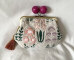 優しい色合いのお花の刺繍が可愛い大きな木玉がま口ミニ財布です