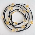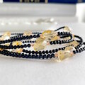 タンブルカットされたシトリンを等分に配置しオニキスで組んだロングネックレス。シトリンを小さなストロベリークォーツで挟むことによって、