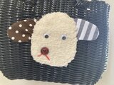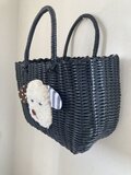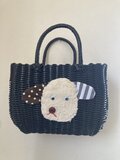 紺色のカゴバッグに、ふわふわの犬の作品を縫い付けました。