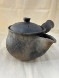 常滑の細かい赤土。無釉焼締めで、炭化焼成しています。炭化の微妙な焼き肌が面白いです。炭化の急須は炭素を生地に染み込ませています。炭素がお茶を美味しく淹れる役割になります。深蒸し茶用の茶漉しをはめ込んでいますので、深蒸し茶が美味しく淹れられます。もちろん他のお茶も美味しく淹れられます。