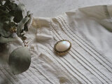 マザーオブパールを囲むフレームはゴールドを帯びた古美色で、エレガントな装飾が施されています。