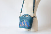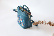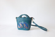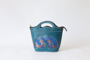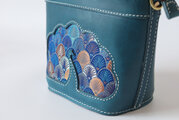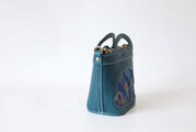 バスケットを思わせるユニークなフォルムに、華やかな孔雀の羽模様をステッチで丁寧に縫い付けました。上品なブルーグリーンの革と、羽根の部分の繊細な色彩のコントラストが美しく、持つだけで気分が上がるアイテムです。