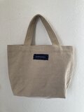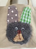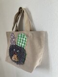 ベージュ色のウォッシュキャンバストートバッグに、ふわふわのうさぎの作品を縫い付けました。