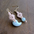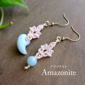 爽やかで優しい色合いの魅力的なアメリカ産アマゾナイト勾玉と丸玉のアシンメトリデザインのマクラメ編みピアスです。アマゾナイトには「信頼と希望の石」といわれお守りにも人気です。