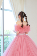 実例写真!オフショルダーのみ くすみピンク ふわふわ もこもこ ドレスアレンジ 披露宴 花嫁