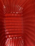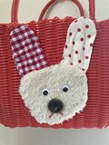 赤色のカゴバッグに、ふわふわのうさぎの作品を縫い付けました。