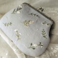 ブルーグレーのリネン混に野の花を手刺繍したがま口ポーチです。