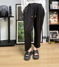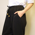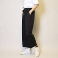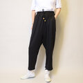 ウエストにひもをつけ、ひも止めとして木製の装飾をつけアクセントになります。